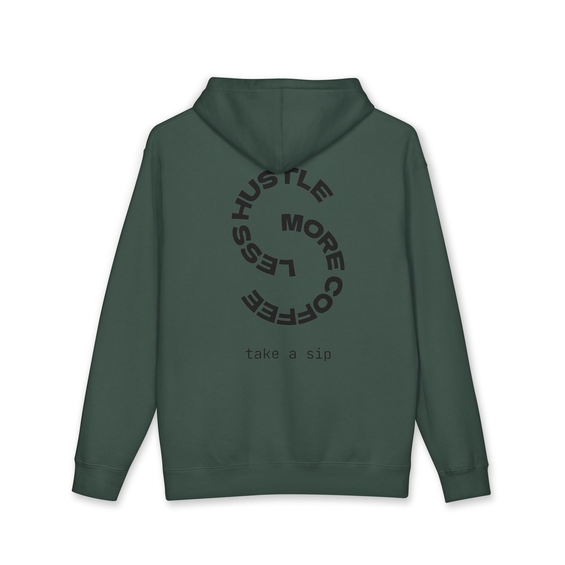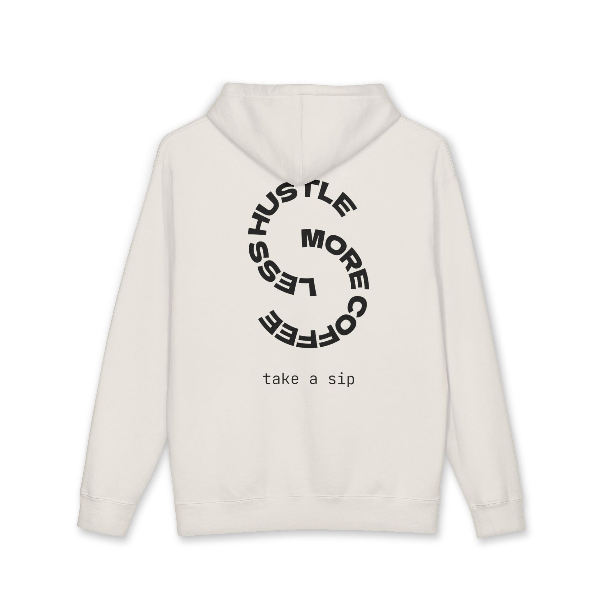 A soft, heavyweight hoodie that wears like quiet confidence. The fleece-lined hood and substantial 10 oz fabric wrap you in warmth while the relaxed fit lets you layer without feeling bulky. Front chest art reads B.O.S.S. in bold, stenciled letters for a subtle, urban edge. On the back, a circular typographic graphic — “HUSTLE LESS MORE COFFEE” — and the small, understated line “take a sip” add tongue-in-cheek personality for folks who move with intention. Neutral tones and clean black print keep the vibe minimal and versatile. Reach-for-it comfort and low-key attitude combine so this hoodie becomes the one you choose for chilly coffee runs, late-night grind sessions, or weekend city wandering.