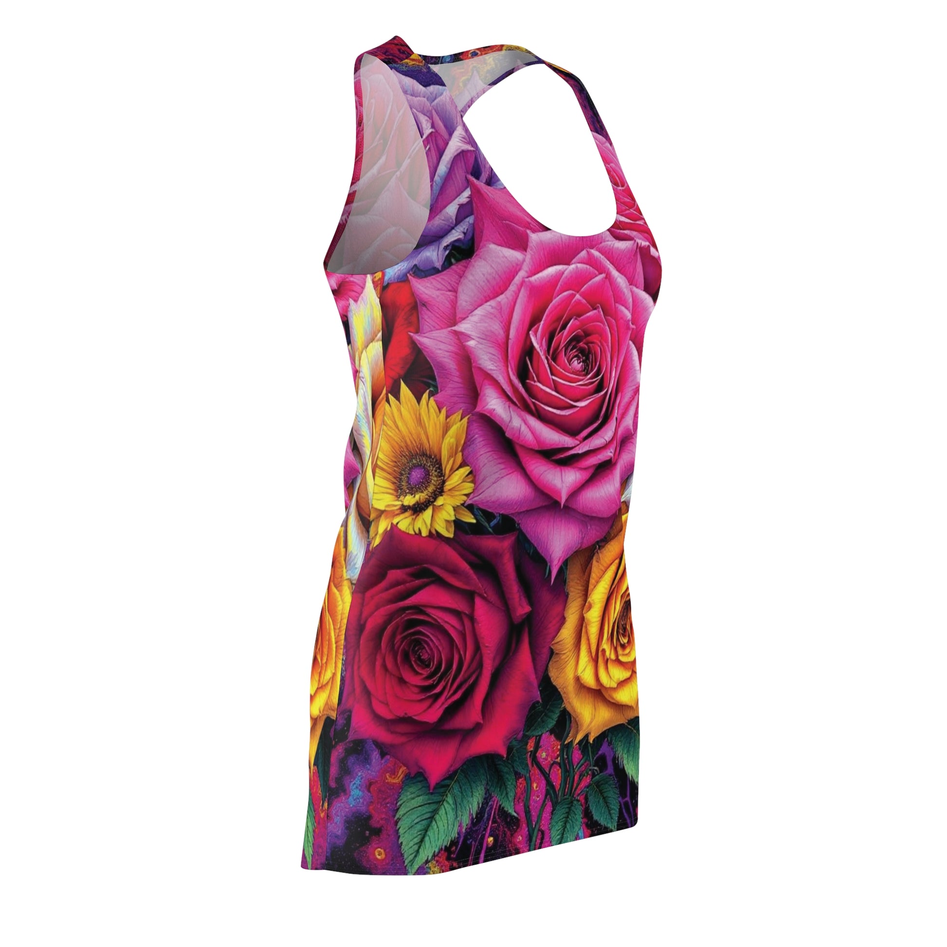 This racerback dress brings a garden in full bloom to everyday wear. Bold, saturated roses—fuchsia, magenta, and honeyed yellow—wrap the lightweight fabric, creating movement and color from every angle. The sporty, close-to-body cut follows your shape while the racerback silhouette keeps shoulders free and breathing easy. It feels like stepping into a summer bouquet: bright, confident, and a little bit wild. Wear it to a weekend market, a backyard gathering, or layered under a denim jacket for evenings when the air cools. The tagless, low-maintenance polyester fabric makes it simple to care for, so the flowers stay vivid without fuss.